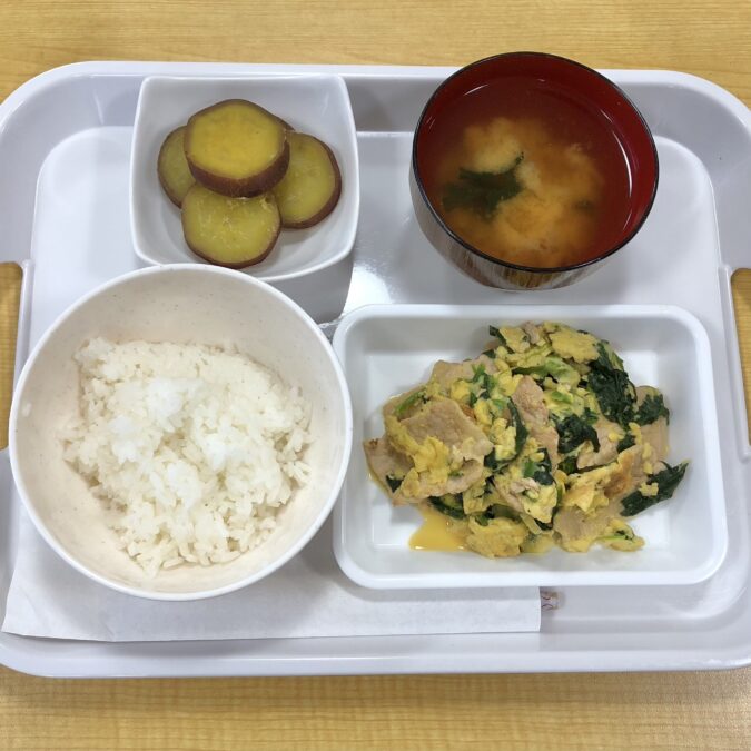 木曜は、ごま油の香ばしさが食欲をそそる、豚肉とほうれん草と卵の炒めもの。甘みのあるさつまいもの甘露煮も添えて、栄養も彩りもバランスよく😊